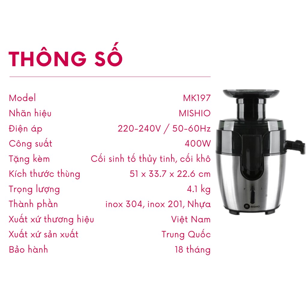 [Mã ELHA22 giảm 6% đơn 300K] Máy ép trái cây cao cấp Mishio MK197 400W (tặng cối sinh tố + cối xay khô)