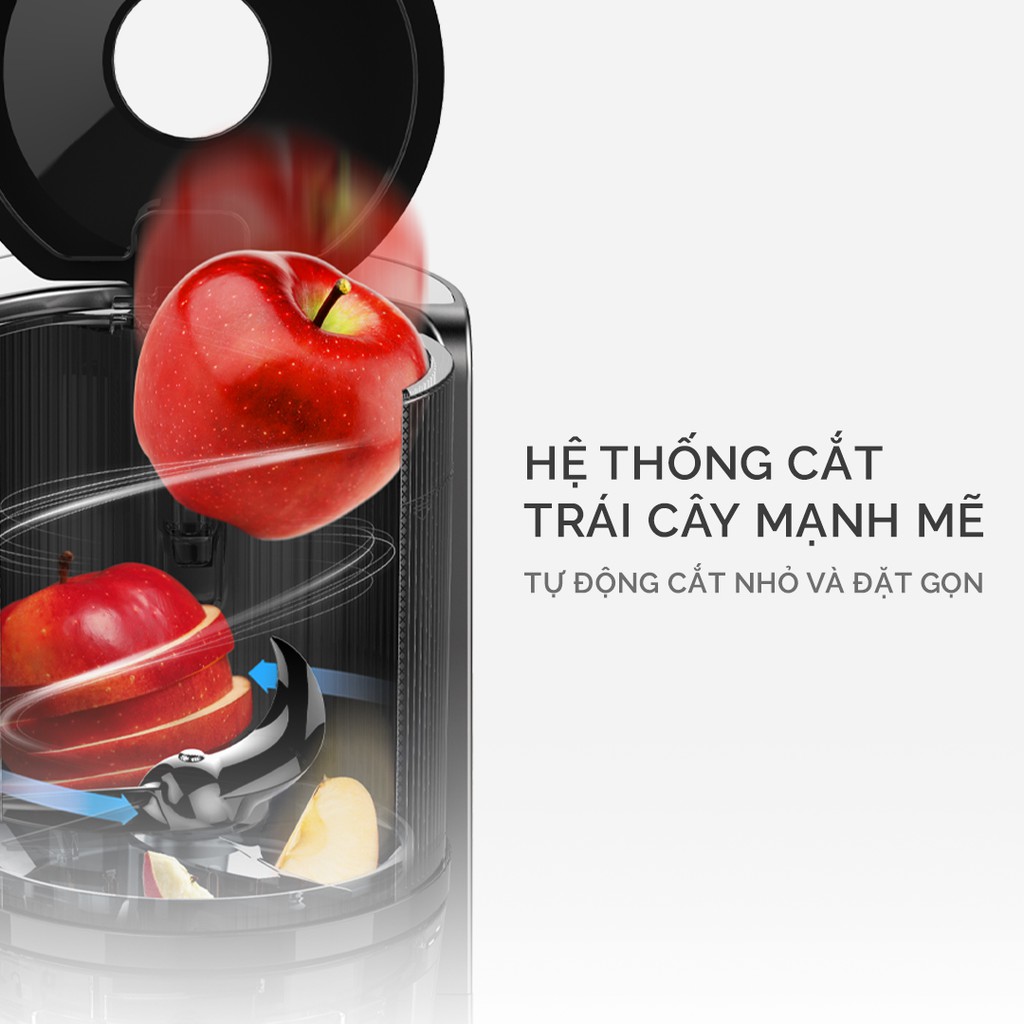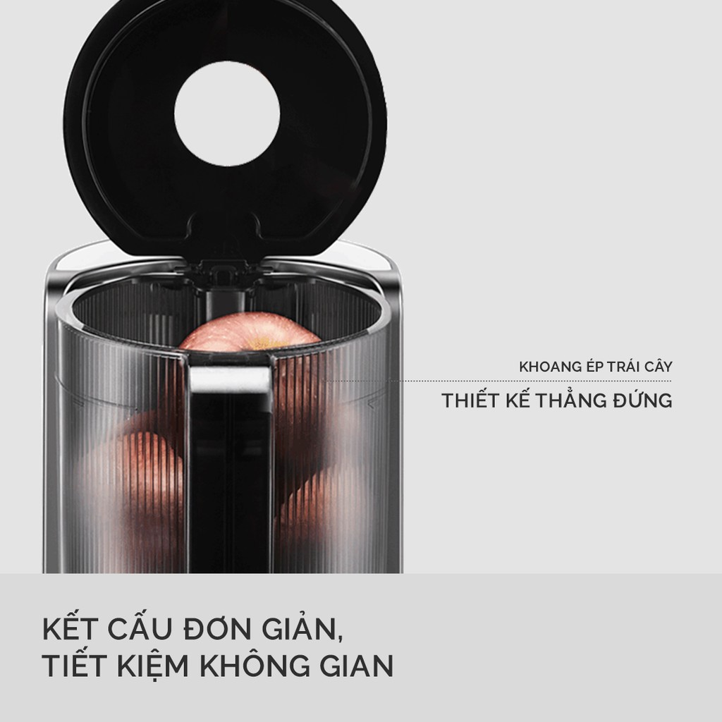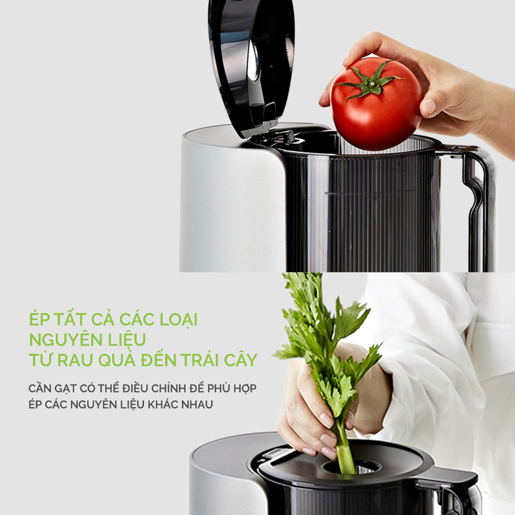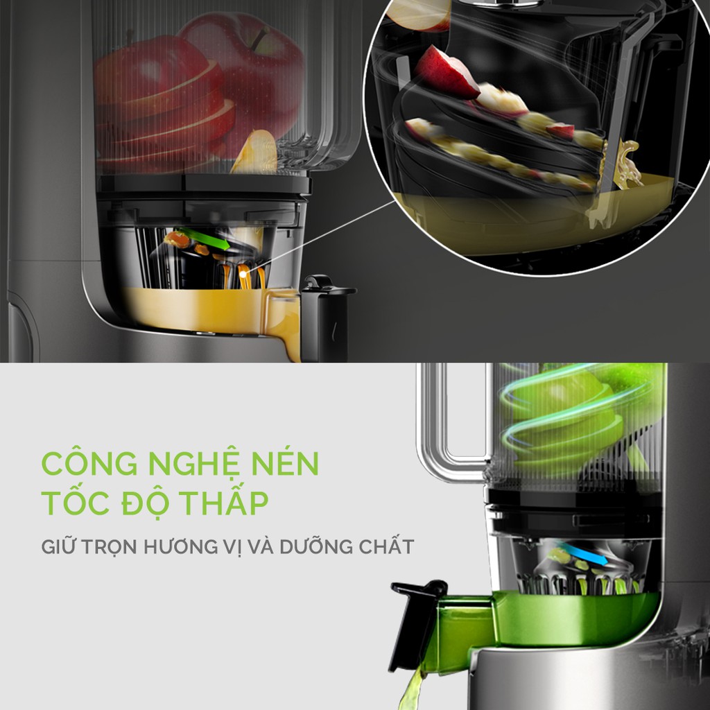 - Song song đó, máy còn sở hữu động cơ mạnh mẽ, không tạo ra tiếng ồn đem đến cảm giác thoải mái nhờ động cơ AC. Máy ép chuyển động theo chiều thẳng đứng và ép chậm rãi với tốc độ từ 40 - 43 vòng/phút. Điều đó làm hương vị, màu sắc của trái cây, rau củ quả được bảo toàn tối đa, phù hợp cho những gia đình có người già và trẻ nhỏ.
