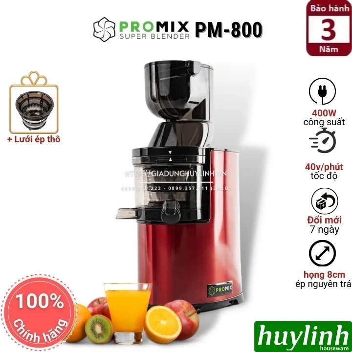 Máy ép chậm Promix PM-800 là dòng máy ép công suất lớn, có thể hoạt động liên tục lên tới 60 phút.Huy Linh phân phối và bảo hành chính hãng tại Promix Việt Nam.