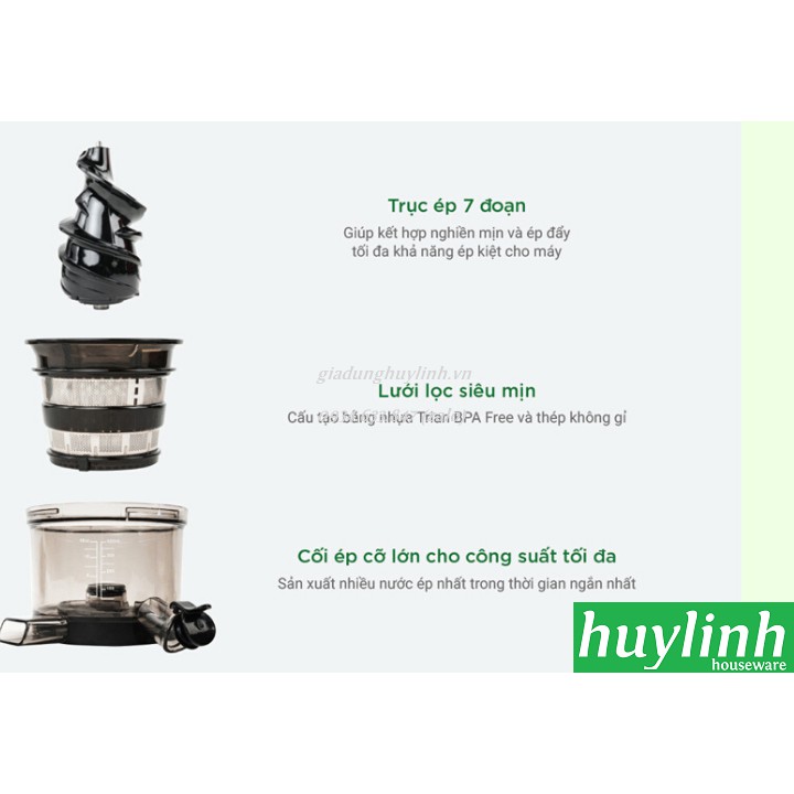 - Thời gian làm sạch và lắp ráp của sản phẩm này cũng đơn giản và nhanh chóng vì tất cả các bộ phận đều có thể rửa độc lập và an toàn với máy rửa chén. Các bộ phận chính có thể tháo rời gồm: máng thức ăn, bộ ép khoan 7 phân đoạn, bộ lọc nước ép.