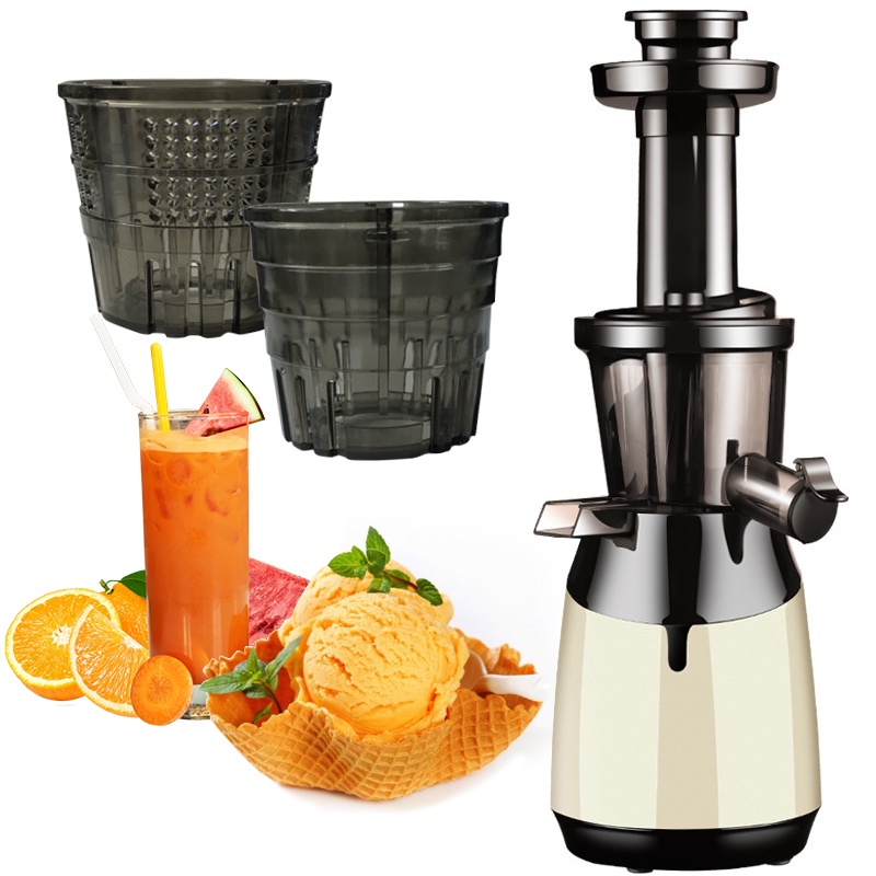 Bộ sản phẩm gồm: máy, cối ép, lưới lọc bã, lưỡi làm kem, 2 khay đựng bã và nước ép