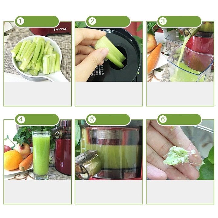 (Lưu ý: Nên cắt khúc 0,5 cm khi ép rau để máy có thể làm việc hiệu quả, cho thêm một ít nước vào khi ép các loại rau ít nước, với một số loại rau, củ cứng và có nhiều chất sơ máy có thể bị kẹt trong quá trình sử dụng)