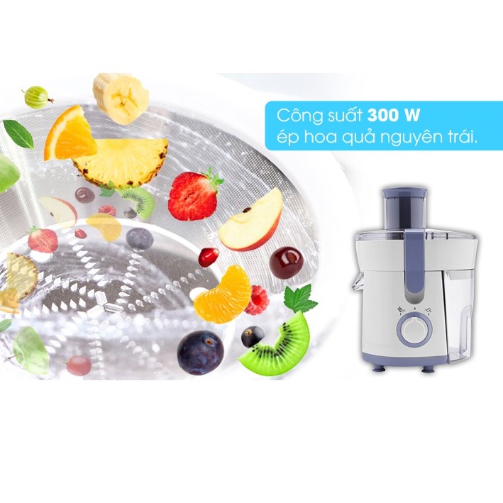 Công suất 300 W, ống tiếp nguyên liệu lớn, ép hoa quả nguyên trái.Tự động ngắt an toàn giảm thiểu các nguy cơ hỏng động cơ.
