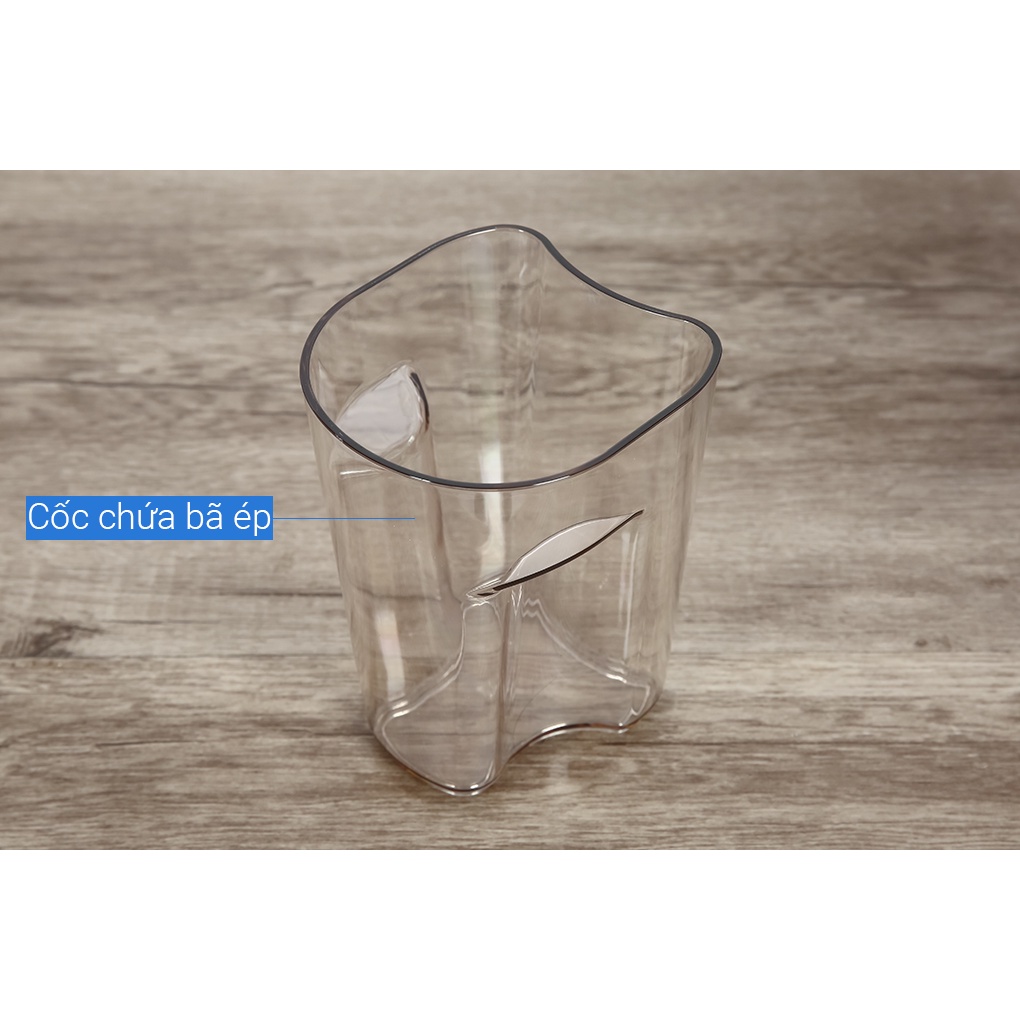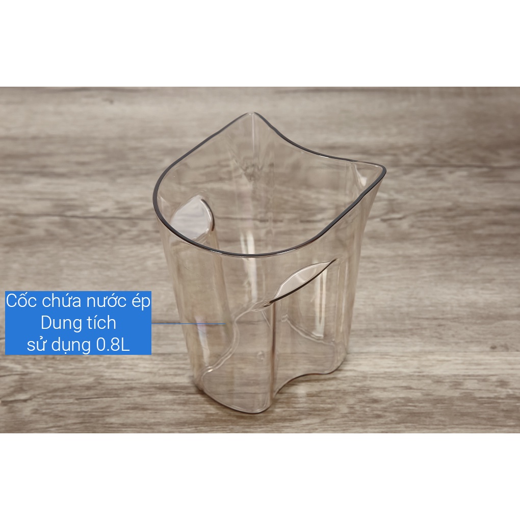 ● Dung tích cốc chứa 0.8 lít chứa được nhiều nước ép cùng lúc. Miệng rót cao có thể hứng nước ép vào ly cao hay ly thấp