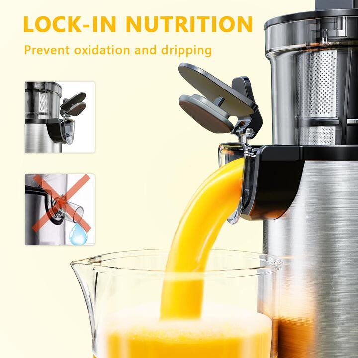 - Thiết kế cơ học mới trục xoắn ốc, 2 tầng lọc với lỗ siêu nhỏ có kích thước khác nhau Phải mất một năm, sau nhiều lần thử nghiệm để có được kích thước và cấu tạo tầng lọc tốt nhất. Tách bã và nước để đảm bảo tỷ lệ nước ép nguyên chất nhưng không bị nghẽn.