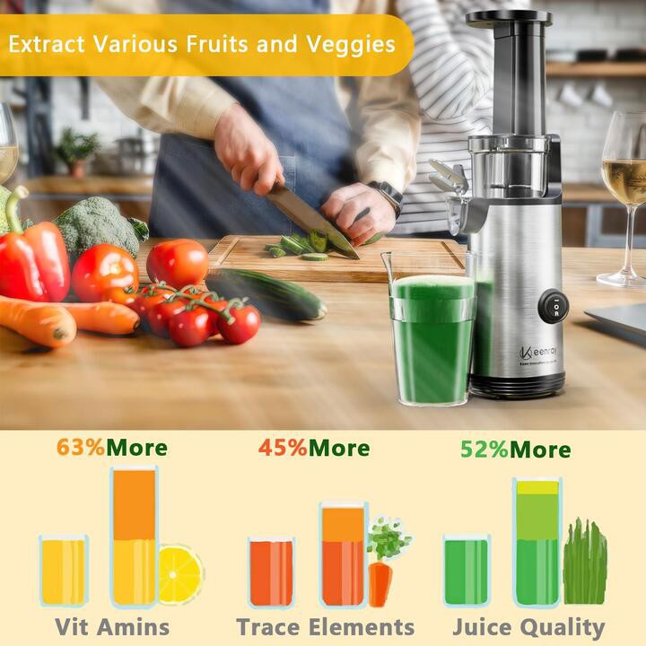 - Máy ép Keenray EL10 hoạt động rất mạnh, giữ được tới 97% vitamin và enzyme trong trái cây. Máy ép được nhiều nước hơn và kiệt bã hơn so với máy ép thông thường. Nước ép cho chất lượng nước ép đậm đặc hơn, giữ nguyên hương vị và không bị phân tầng, tách nước.