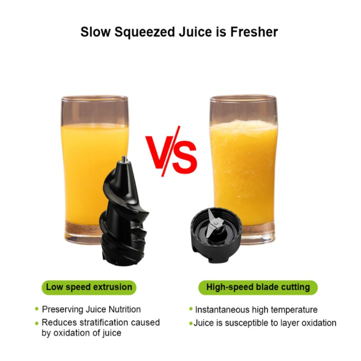 - Làm việc với tốc độ thấp hơn (40-65 RPM), rất tốt để giữ lại giá trị dinh dưỡng của trái cây, cần tây, cỏ lúa mì, gừng, rau lá xanh, cà rốt, táo, cam...