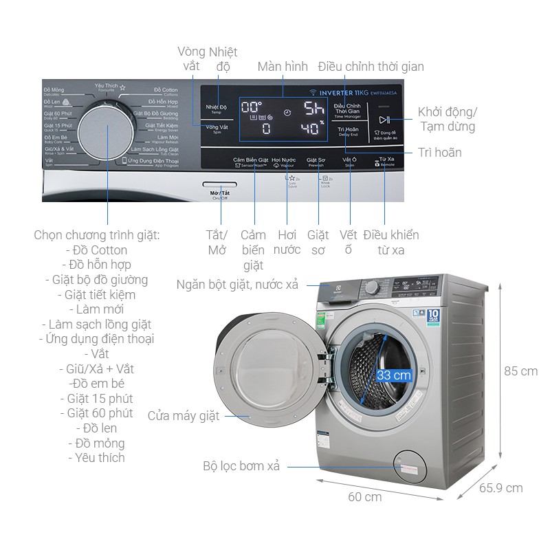 Tiện ích:Giặt nước nóng, Thêm quần áo khi máy đang giặt, Khóa trẻ em, Công nghệ Inverter - Tiết kiệm điện, Giặt hơi nước, Vệ sinh lồng giặt, Hẹn giờ giặt xong, Chương trình giặt nhanh