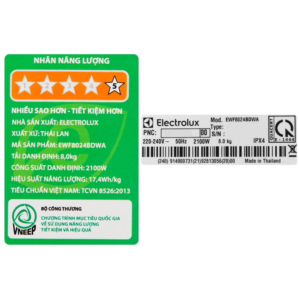 Thông số kỹ thuật chi tiết Máy giặt Electrolux Inverter 8 kg EWF8024BDWA