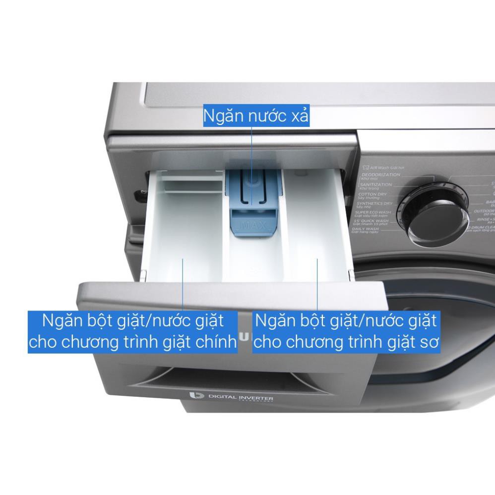 Tiện ích:Giặt nước nóng, Chức năng sấy, Khóa trẻ em, Thêm đồ khi đang giặt với cửa phụ Add Door, Vệ sinh lồng giặt