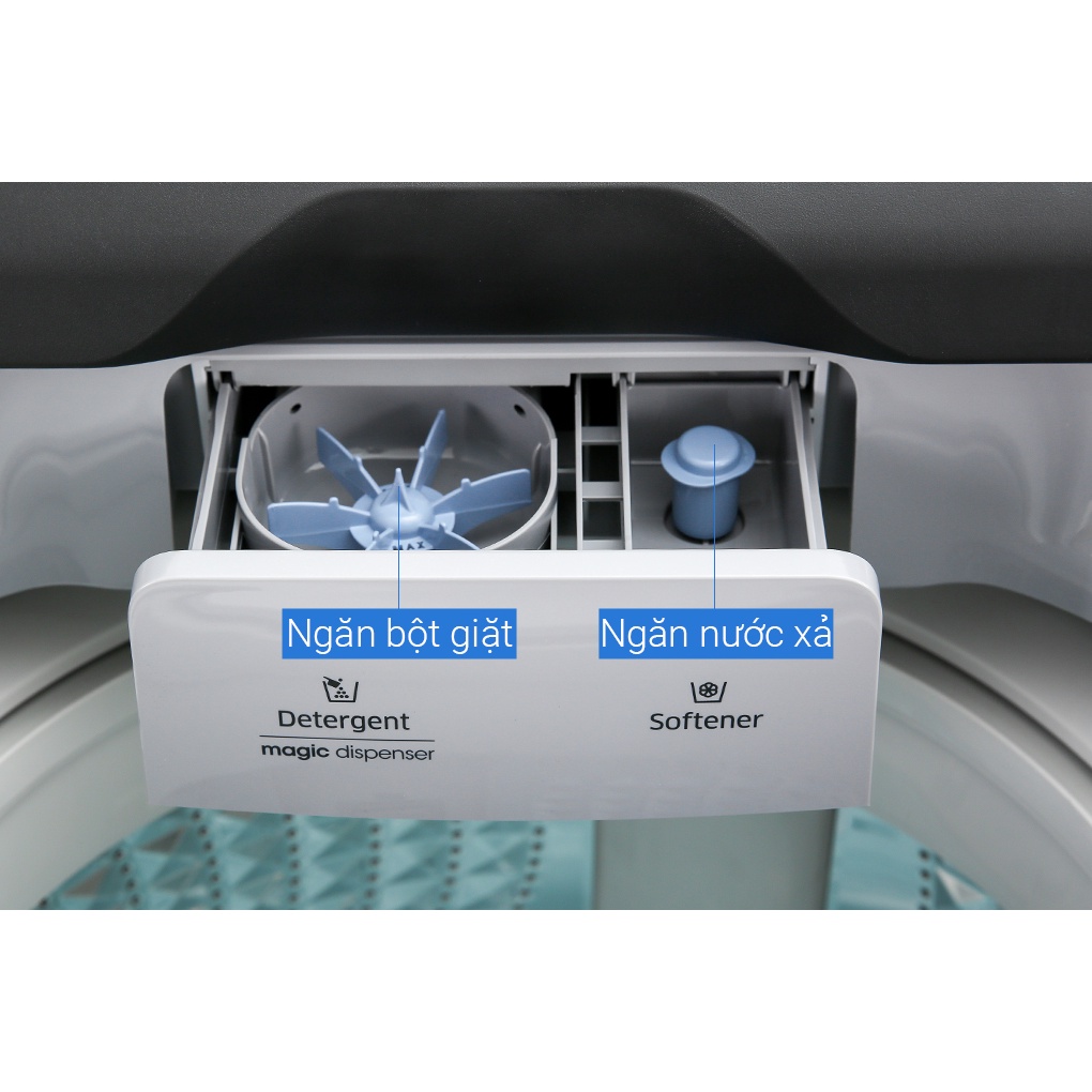 Hộp Magic Dispenser sử dụng cánh quạt xoay để tạo ra luồng nước mạnh mẽ, giúp hòa tan bột giặt nhanh chóng trước khi đổ xuống lồng giặt, nhằm hạn chế tình trạng đóng cặn bột giặt trên quần áo.
