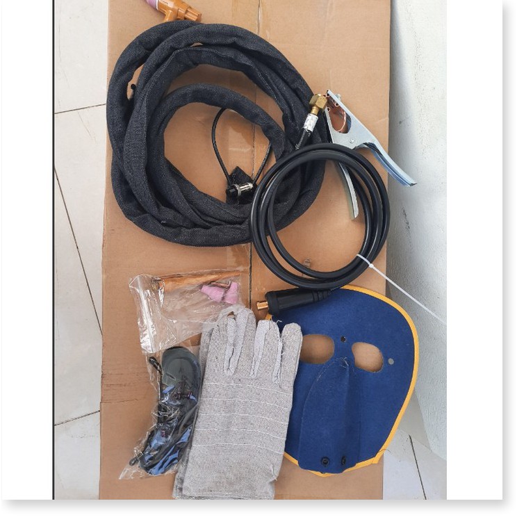 Phụ kiện : kìm hàn 3m, cáp mat 2m và một BỘ SÚNG Tig 4m, bao tay hàn, mặt nạ hàn, cổ dê xiết ống khí