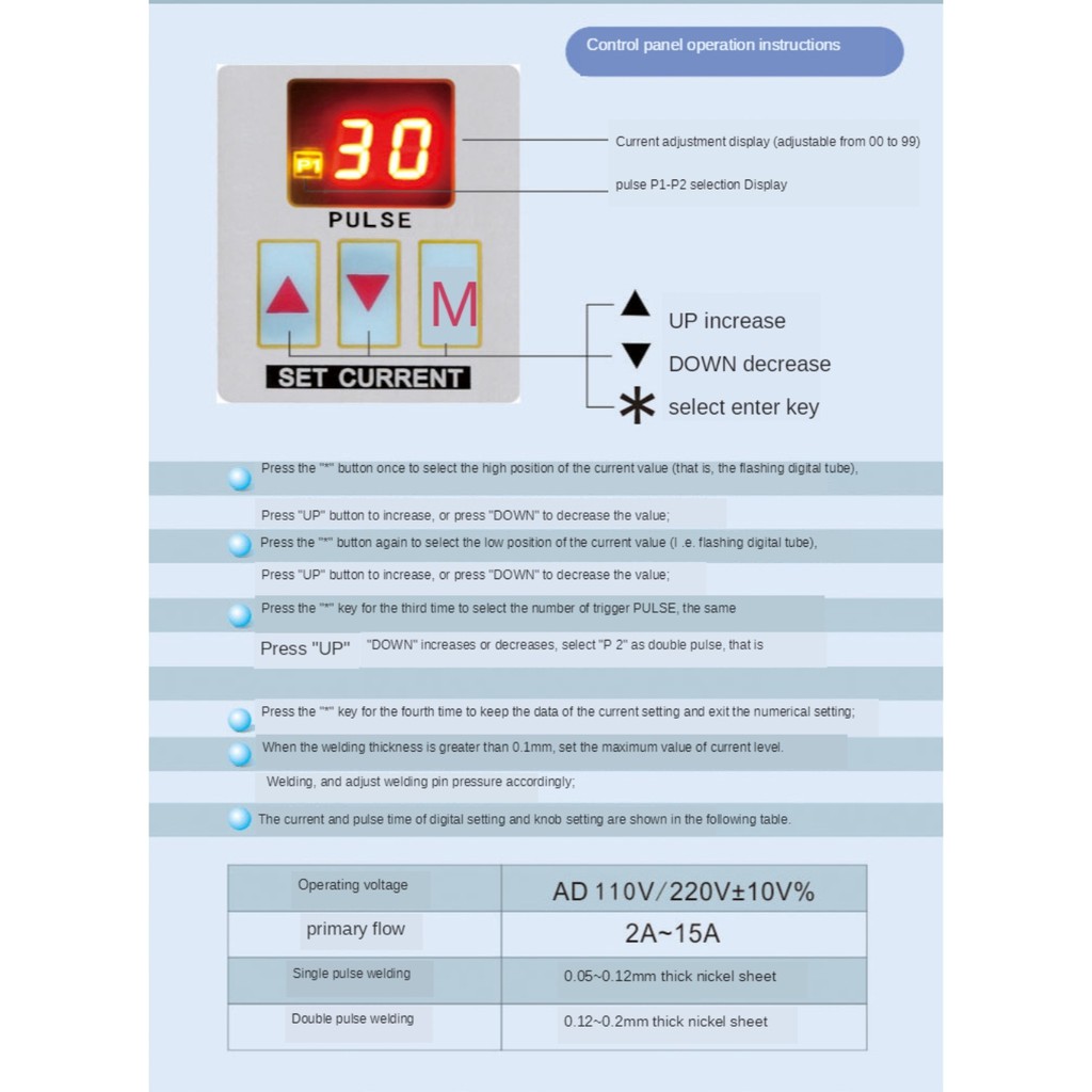 lập độ lớn của dòng hàn. Chương trình sẽ tự thiết lập và lưu vào bộ nhớ sau khi tắt. Dòng của máy có thể điều khiển từ 00-99, thường được sử dụng ở 25. Khi kim hàn xuống đển điểm hàn, mạch sẽ đóng và bắt đầu hàn