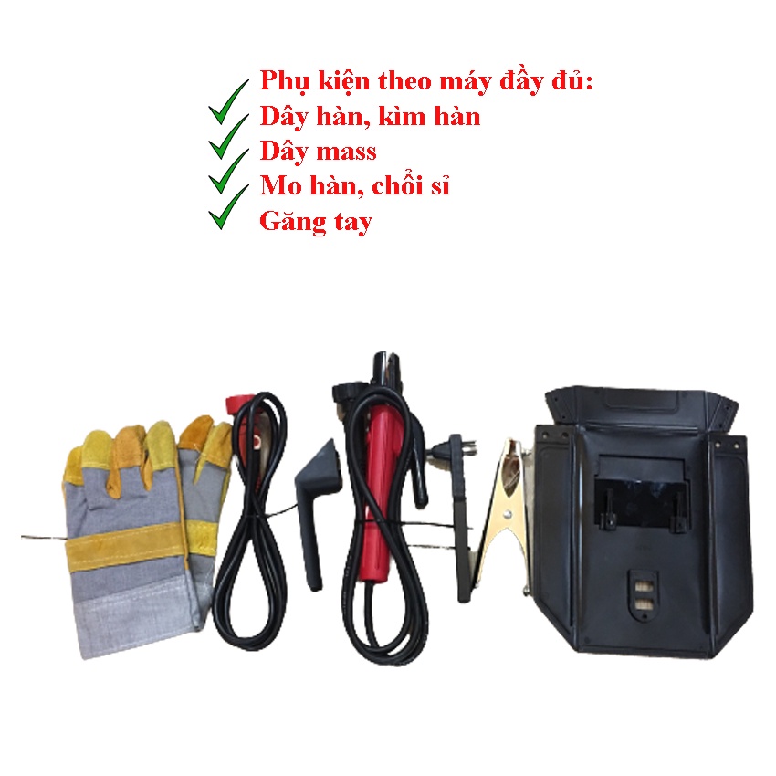 - Phụ kiện đi kèm : Găng tay, dây kẹp hàn , 1 dây kẹp mass , dụng cụ vệ sinh xỉ hàn, mo hàn