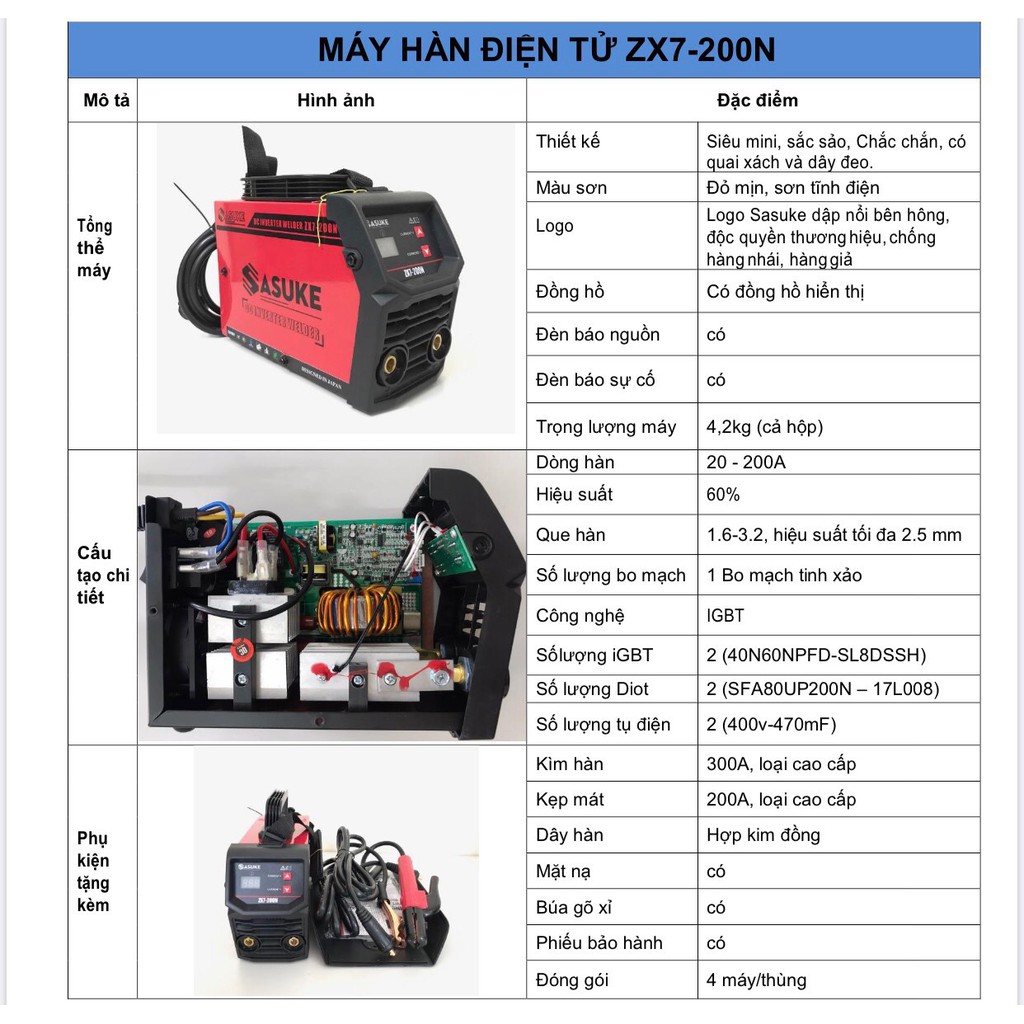 THÔNG SỖ KỸ THUẬT CỦA MÁY HÀN INVERTER SASUKE✔️Model: ZX7-200N