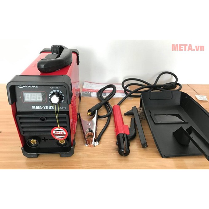 Máy hàn đi kèm kẹp mass, kìm hàn, mặt nạ hàn, búa gõ xỉ hàn.