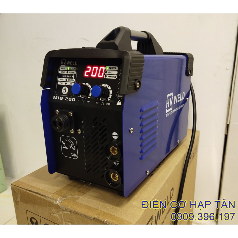 - Máy hàn Mig không dùng khí HV WELD 200 mini 4 chức năng với dòng hàn 200A giúp dễ mồi hồ quang điện, hồ quang cháy êm, mối hàn được bóng đẹp, ngấu.
