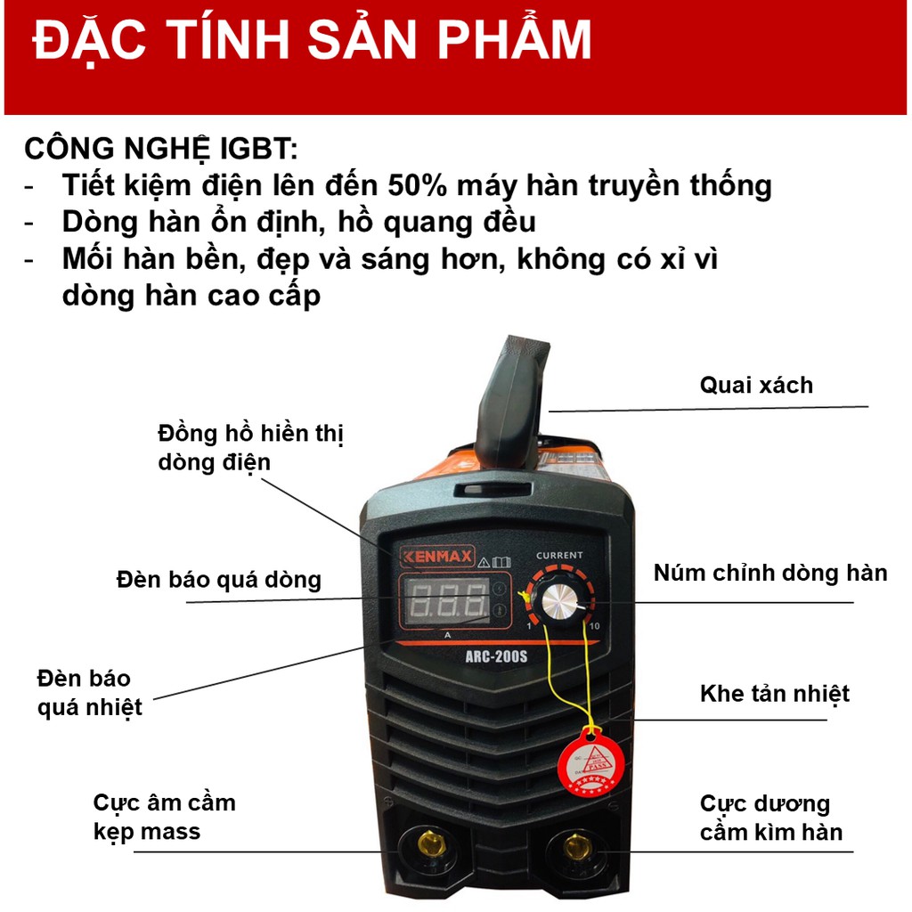 💥 Máy hàn Kenmax tạo ra dòng hàn ổn định, hồ quang đều, mối hàn sắt bền đẹp, chắc chắn. Kenmax ARC-200S có thể điều chỉnh dòng hàn trong phạm vi từ 20A – 200A. Máy cũng được trang bị màn hình Led hiển thị dòng hàn nhìn rất hiện đại, dễ hiểu.