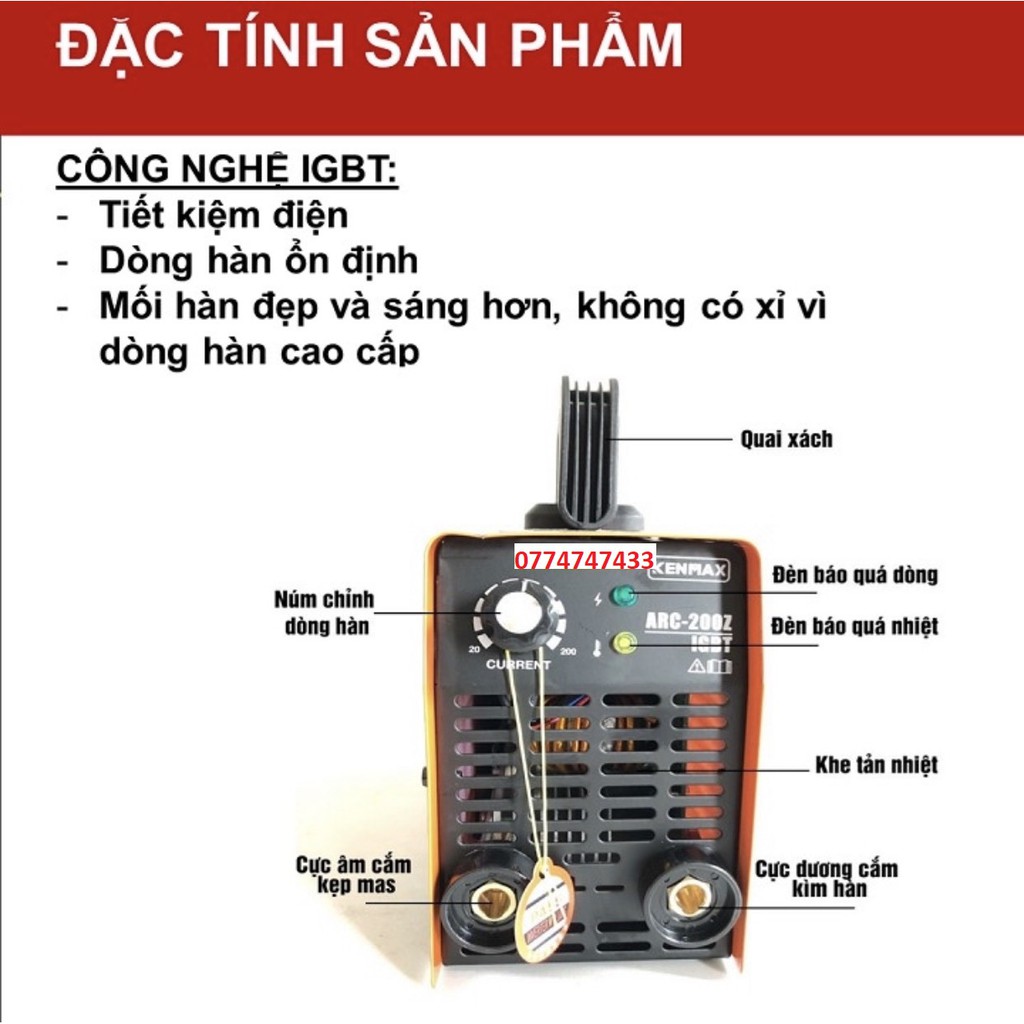 🔯 Máy hàn mini Kenmax ARC 200Z có khả năng điều chỉnh dòng hàn lên tới 200A sẽ giúp công việc của bạn trở lên nhanh chóng. Máy hàn que có cấu trúc chắc chắn với lớp vỏ ngoài bằng kim loại sơn tĩnh điện chống gỉ, bên trong gồm 1 bo mạch, 2 tụ.🔯 Máy hàn que Kenmax được ứng dụng công nghệ IGBT có ưu điểm vượt trội như: