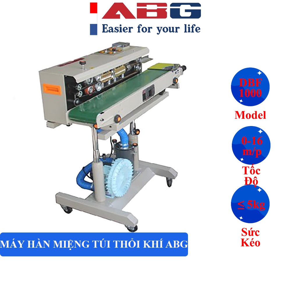 Máy Hàn Miệng Túi Thổi Khí Liên Tục ABG DBF1000A Chuyên Dụng Đóng Gói Miệng Bao Công Nghiệp Dùng Trong Nhà Hàng Và Nhà XưởngMáy hàn miệng túi thổi khí liên tục ABG DBF- 1000A là máy móc, thiết bị mới được tích hợp thêm bộ phận thổi khí trên thân máy, giúp cho túi đựng thành phẩm căng hơn, đẹp mắt hơn