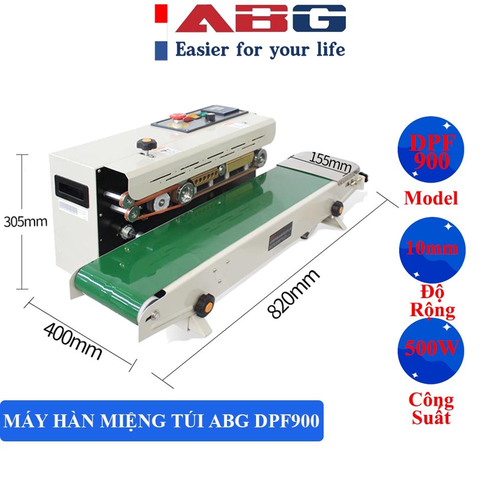 - Máy Hàn Miệng Túi Tự Động ABG DPF900 Loại Đứng là một sản phẩm được chế tạo thông minh, kích thước nhỏ gọn, thân vỏ được làm bằng inox, băng tải PVC bền bỉ, nhông được làm bằng thép kết hợp với moter giảm tốc DC. giúp máy vận hành êm ái và độ bền cao.