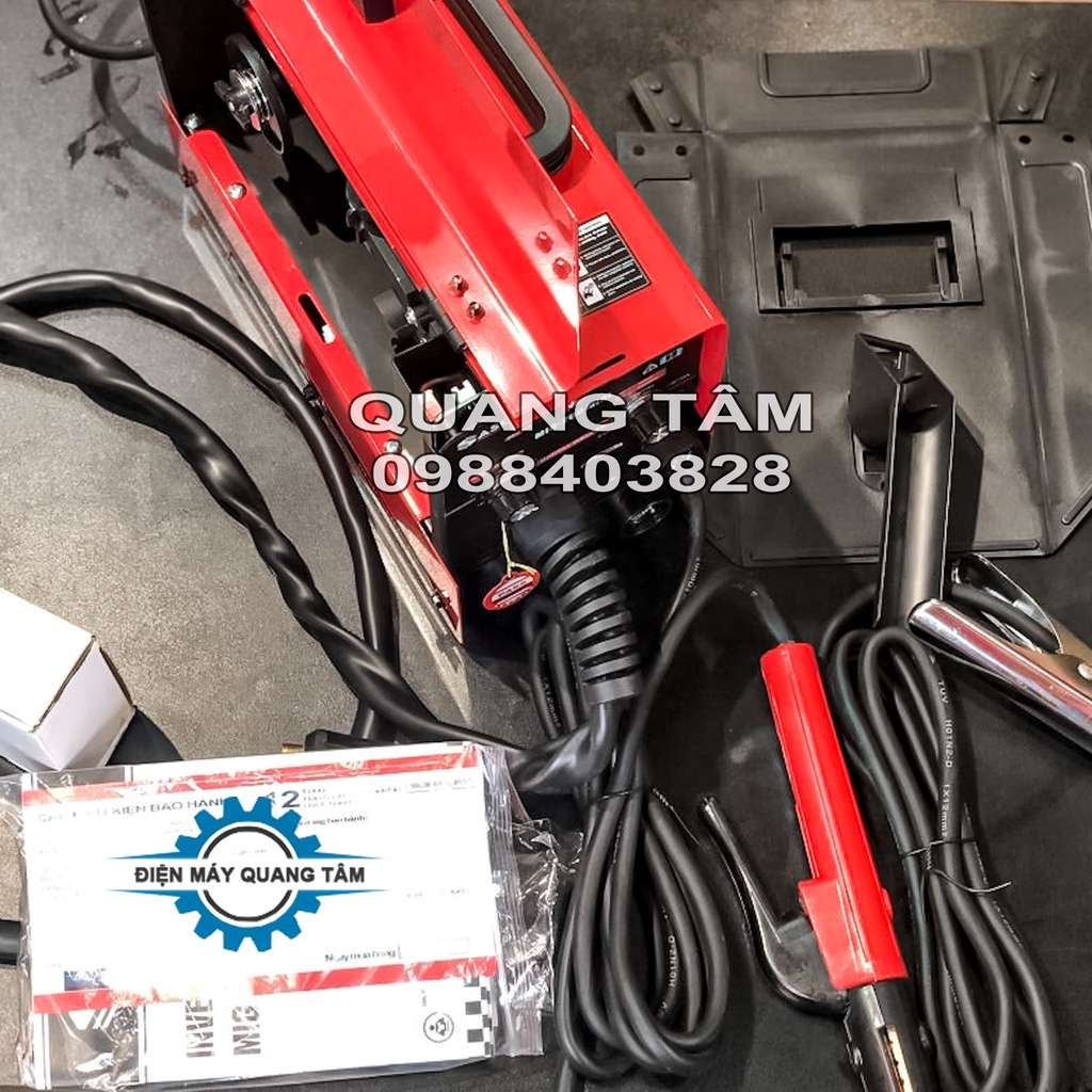 - Phụ kiện đi kèm gồm có kìm hàn, kẹp mass, súng hàn, mặt nạ, dây đeo và búa gõ sỉ. Tặng 1 cuộn 1Kg (3 bép + 1 con lăn)