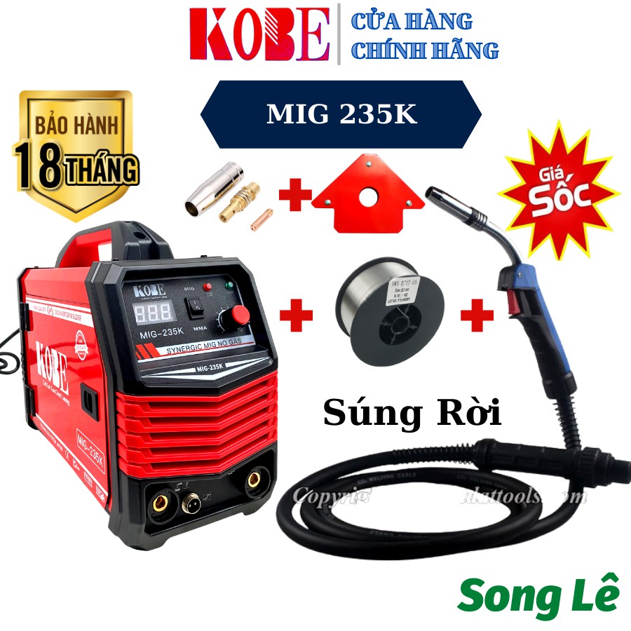 máy hàn mig ko dùng khí KOBE 235K 2 chức năng hàn không dùng khí và hàn que. Giúp máy bền hơn và cho ra mối hàn chất lượng hơn. Máy sử dụng công nghệ tử điều chỉnh, máy chỉ có 1 nút điều chỉnh ra dây và dòng điện chung. Giúp chúng ta không cần chỉnh nhiều, nhưng vẫn ra được mối hàn đẹp.