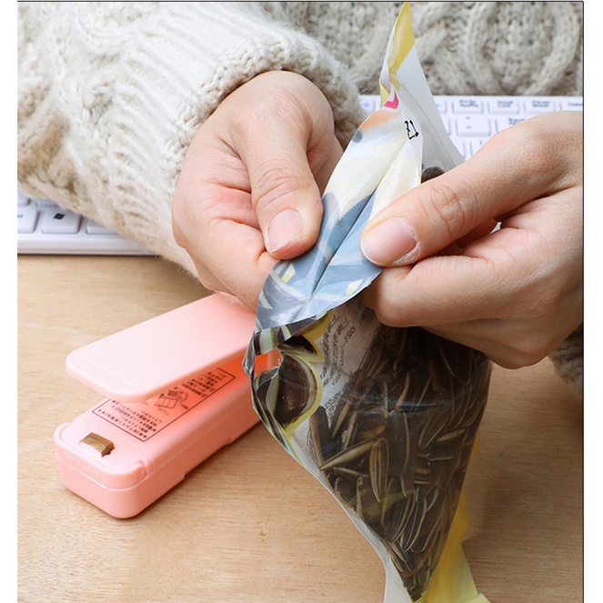 - Máy dán miệng túi mini hoạt động bằng 2 pin 1.5V, tạo sức nóng để hàn kín miệng túi, sử dụng trong các trường hợp cụ thể như: hàn các loại đồ ăn đã bóc dở như bim bim, túi bánh, kẹo, hoặc hàn miệng túi đựng các loại đồ khô, đồ cần được bảo quản trong tủ lạnh.