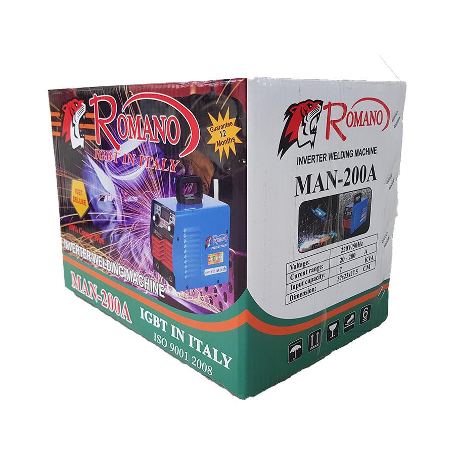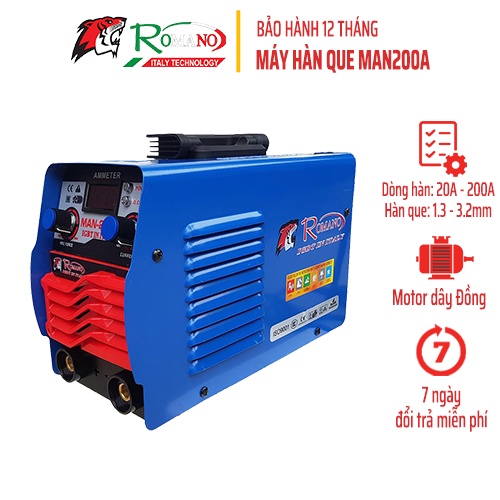 - Máy hàn hồ quang điện tử ROMANO MAN-200A là sản phẩm của thương hiệu ROMANO, thuộc dòng máy hàn que rất được các thợ cơ khí và người làm nghề xây dựng tin dùng.