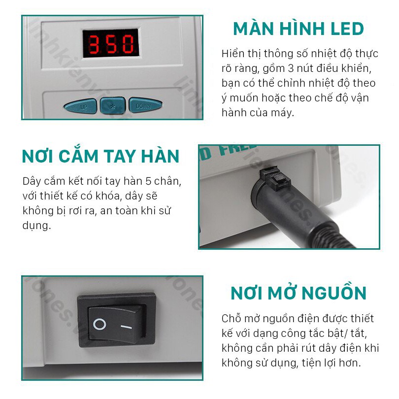 – Màn hình LED x 3pcs thể hiện nhiệt độ cài đặt và nhiệt độ hiện hành của tay hàn.
