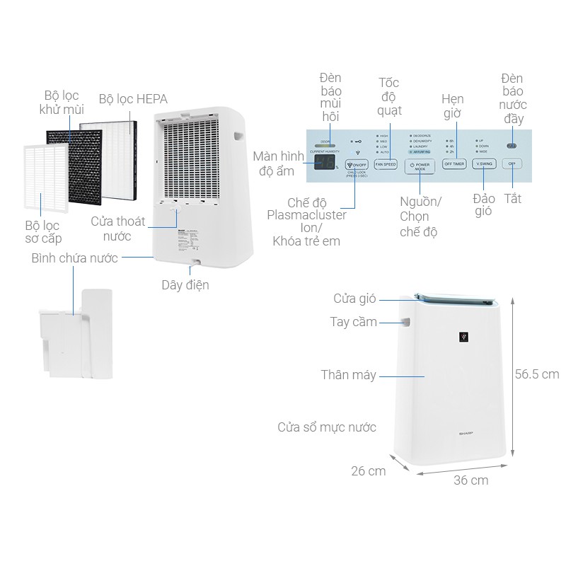 - Tiện ích: Plasmacluster Ion mật độ cao tiêu diệt nấm mốc trong không khí, khử mùi thuốc lá, phấn hoa, Lọc được bụi mịn PM 2.5, Hút ẩm nhanh chóng, Có khoá trẻ em, Hẹn giờ tắt, Hiển thị chất lượng không khí bằng đèn màu, Bánh xe di chuyển