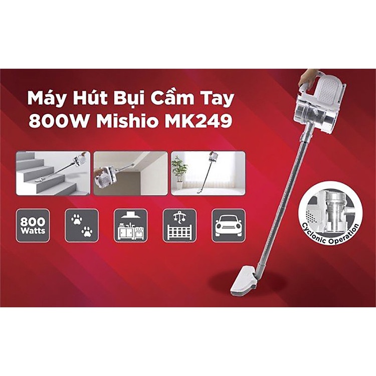 Máy Hút Bụi Cầm Tay Công Nghệ Lốc Xoáy Mishio MK249 800W – Hiện Đại Từ Kiểu Dáng Đến Công NăngMishio là một trong những thương hiệu chuyên về điện gia dụng trong thời gian gần đây. Cùng với sự phát triển liên tục này, hãng Mishio ra mắt sản phẩm máy hút bụi cầm tay có công nghệ lốc xoáy Mishio MK249 với thiết kế trắng tinh tế, hiện đại, bạn dễ dàng thao tác nhẹ nhàng mà vẫn làm sạch không gian sống mọi ngõ ngách nhờ công nghệ lốc xoáy cực mạnh. Thiết bị này sẽ chiếm được niềm vui và sự hài lòng của bạn.