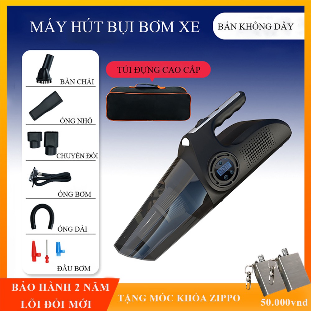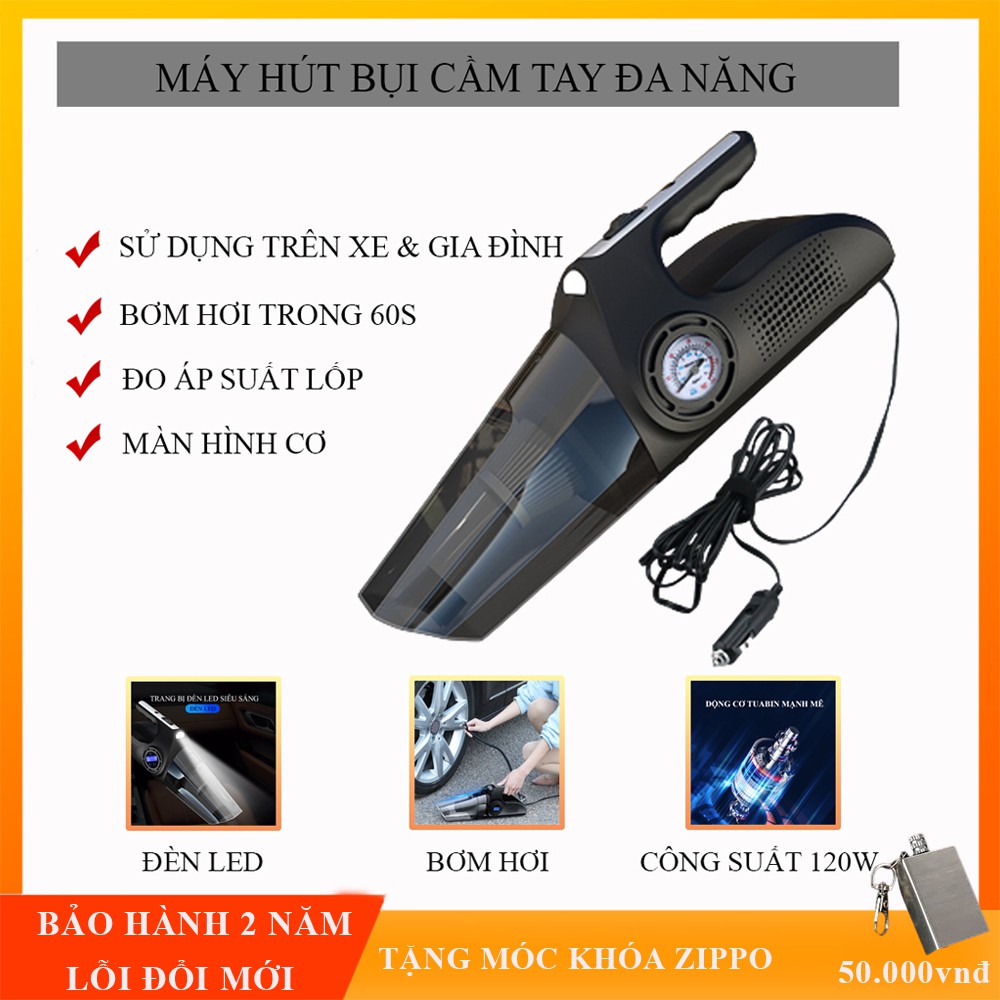 Máy hút bụi cầm tay đa năng 4 trong 1 cho gia đình và ô tô, hút bụi, bơm lốp, đo áp suất lốp kèm đèn pin tiện dụng.