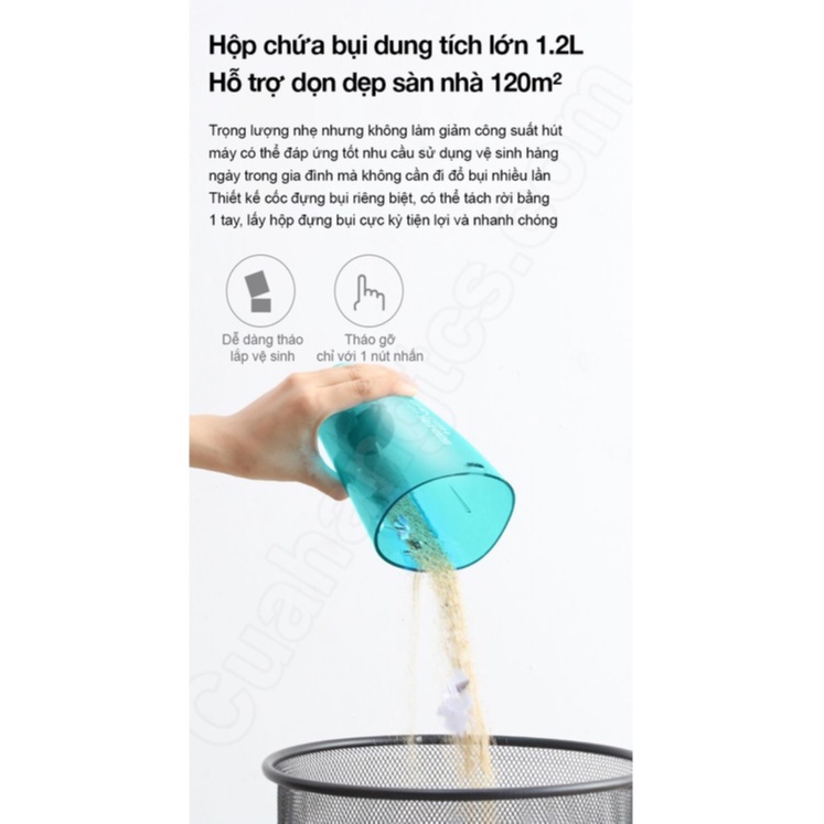 -Dung tích hộp chứa bụi lớn 1.2 lít giúp làm sạch không gian lớn mà không cần nhiều lần đổ bụi, dễ tháo rời vệ sinh