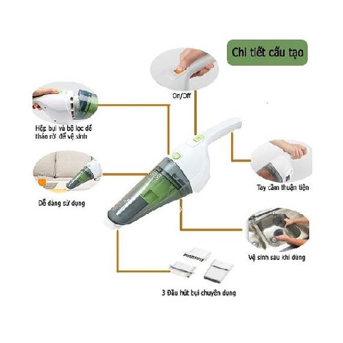 Máy hút bụi cầm tay sử dụng pin nhỏ gọn Hiệu điện thế: 7.2V Công tắc điều khiển Switch-off Khả năng làm sạch bụi bẩn, đồ vật nhỏ Dễ dàng len lỏi mọi ngóc ngách khó tiếp cận Bộ lọc bụi và bộ lọc có thể được lấy ra để làm sạchThiết kế nhỏ gọn
