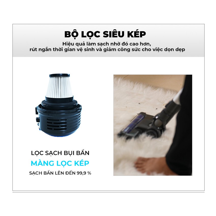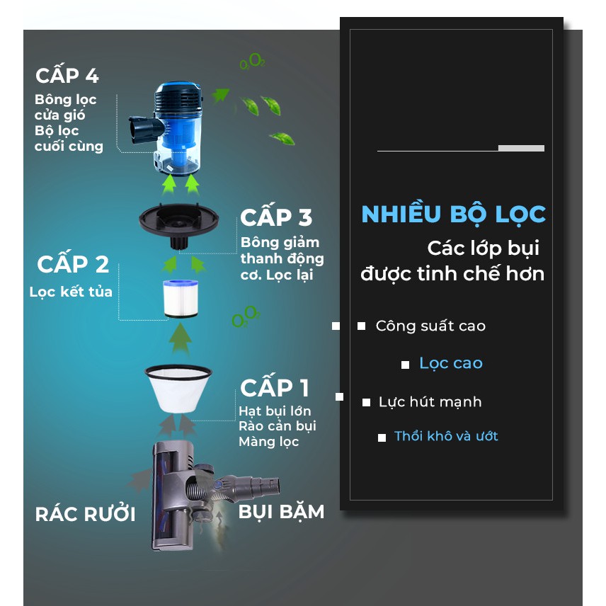 - Lực hút cực khỏe 11000 Pa (có thể hút đc bụi mịn 0.3 micron) Loại bỏ bụi thô hư hạt, sỏi, cát, các loại ký sinh trùng bọ rệp, nấm mốc, phấn hoa, lông chó lông mèo, bụi mịn, tác nhân gây ngứa và dị ứng,…