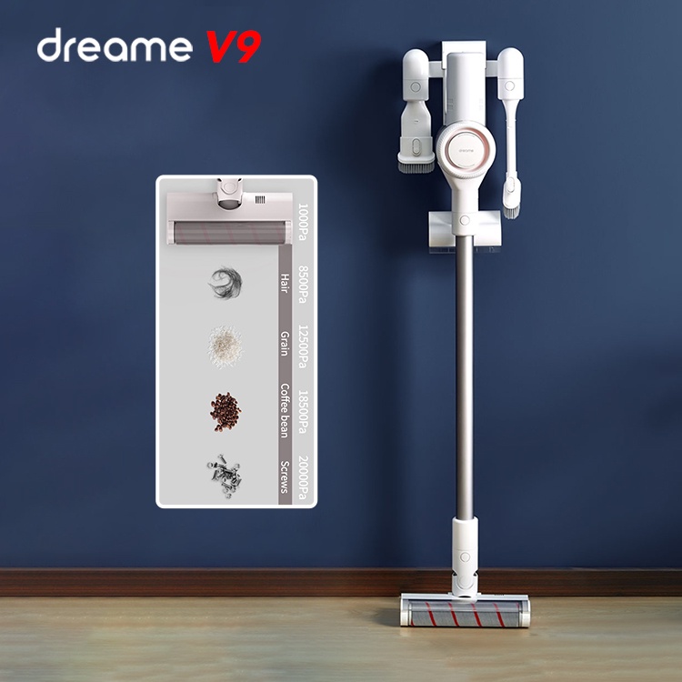 - Máy hút bụi không dây Dreame V9 được trang bị động cơ không chổi than tốc độ cao Space3.0 với khả năng khởi động nhanh 0.3s, tốc độ lên đến 100.000 vòng/phút, lực hút 120AW hấp thụ mạnh mẽ. Thiết kế bộ lọc 5 tầng HEPA, công nghệ tách lốc xoáy hình nón cùng thiết kế ống dẫn khí không chặn lực hút tạo ra lực ly tâm mạnh với khả năng tách đến 99.99% phấn hoa, tất cả các loại bụi được khóa trong cốc bụi.