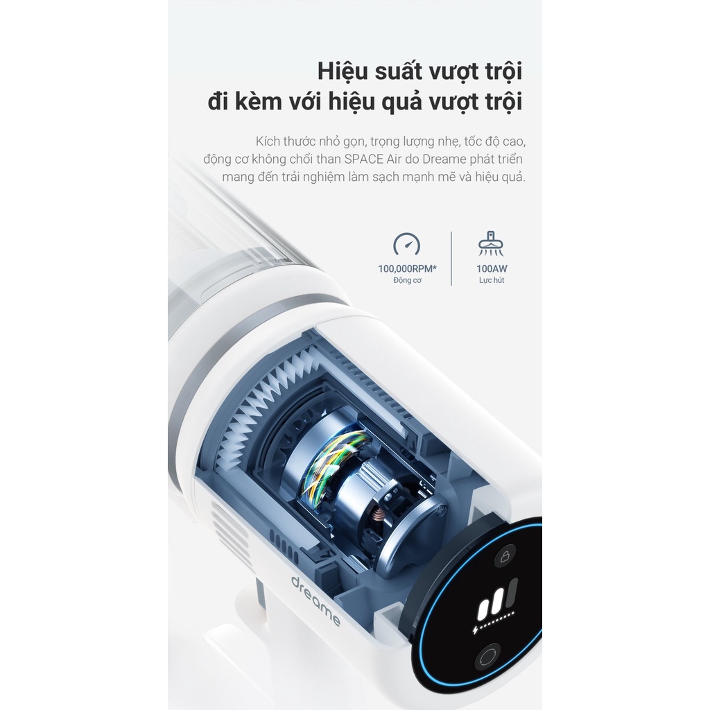 Dreame độc quyền động cơ hút công suất cao Air Space, với khả năng hoạt động chỉ trong 0.3 giây. Động cơ xoay đặt tốc độ 100 000 vòng/phút giúp đảm bảo hút sạch mọi bụi bẩn, lông tóc và mảnh vụn nhanh chóng và hiệu quả. Ngoài ra, động cơ này còn có khả năng hoạt động liên tục trong thời gian dài, giúp người sử dụng làm sạch trên diện rộng.