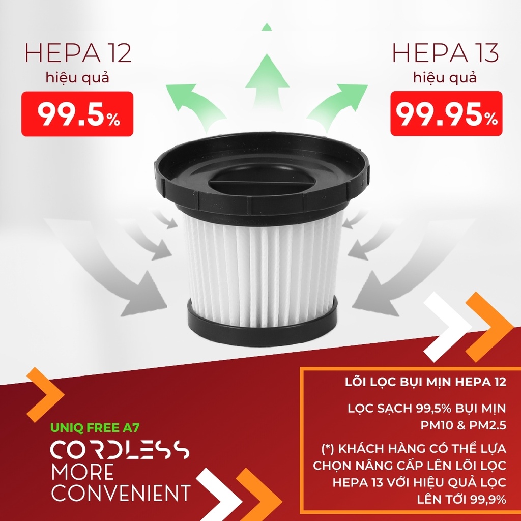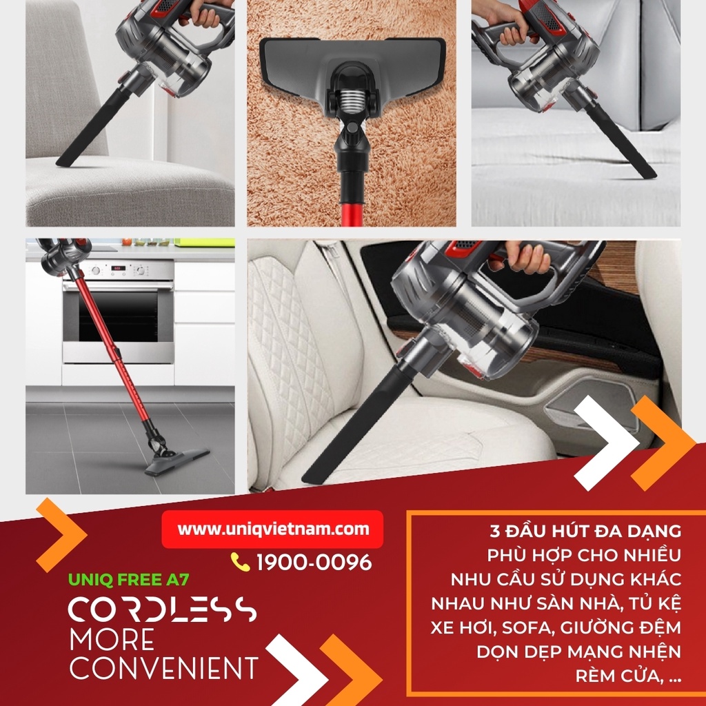 THÔNG TIN CHI TIẾT SẢN PHẨM MÁY HÚT BỤI KHÔNG DÂY CẦM TAY GIA ĐÌNH UNIQ FREE A7