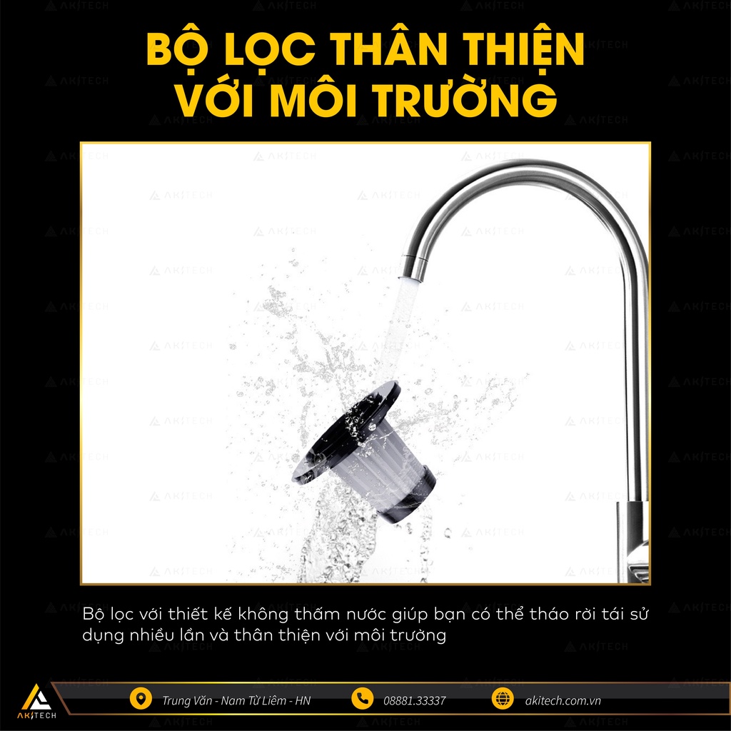 - Bộ lọc với thiết kế không thấm nước giúp bạn có thể tháo rời tái sử dụng nhiều lần và thân thiện với môi trường