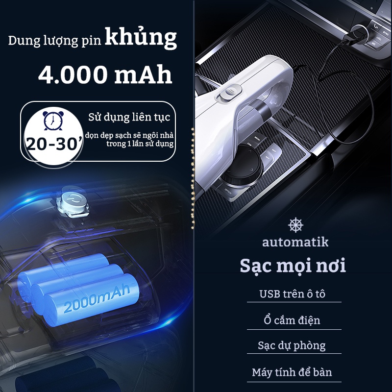 Công nghệ hút lốc xoáy MẠNH MẼ 12.000 pa, cánh quạt lưỡi nhôm hút trong thời gian dài, KHÔNG SUY GIẢM, không nóngDung lượng pin KHỦNG 4.000 mAh, sử dụng liên tục 20-30 phút, dọn dẹp sạch sẽ ngôi nhà trong một lần sử dụng, sạc MỌI NƠI: USB ô tô, ổ cắm điện, sạc dự phòng, máy tính để bàn, laptop