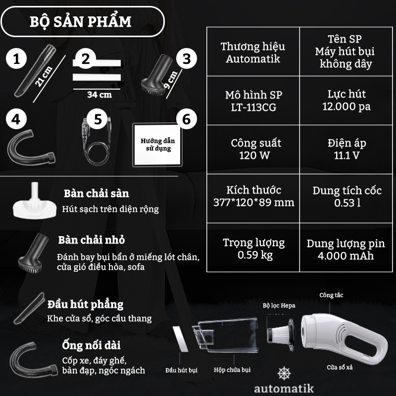 Bộ sản phẩm máy hút bụi Automatik gồm: máy hút, bàn chải sàn, ống nối dài, bàn chải nhỏ, đầu hút phẳng, bộ sạc USB