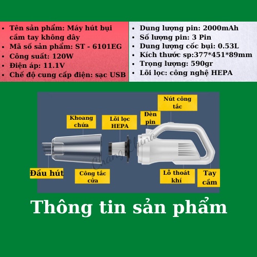 Máy hút bụi cầm tay không dây Suitu ST - 6101EG - Máy hút bụi cầm tay không dây nhà và ô tô Suitu ST - 6101EG.Thông tin chi tiết sản phẩm: