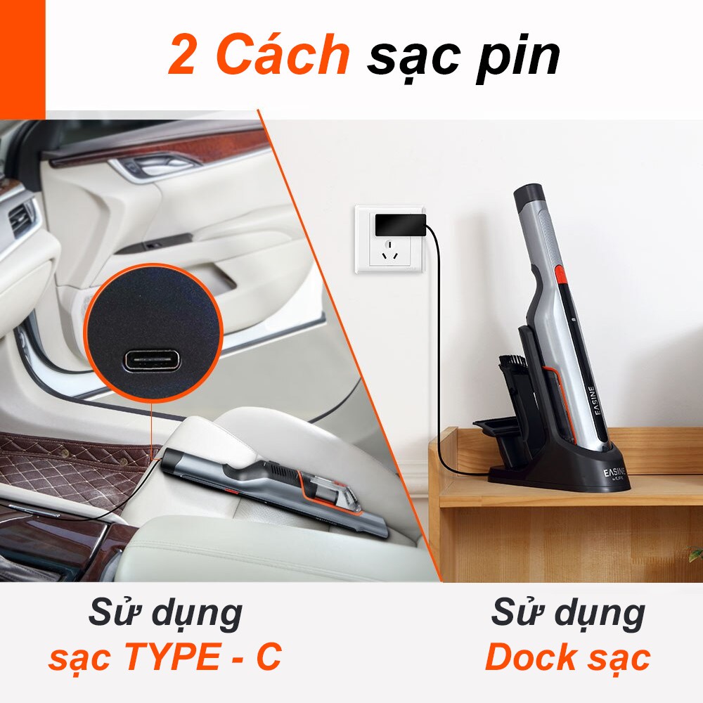 Với ILIFE M50, bạn có 2 cách để sạch chúng đó là sạc băng đế sạc hoặc cắm trực tiếp bằng cáp USB Type-C. Thời gian sạc máy hút bụi cầm tay này khoảng trong 2-3h.