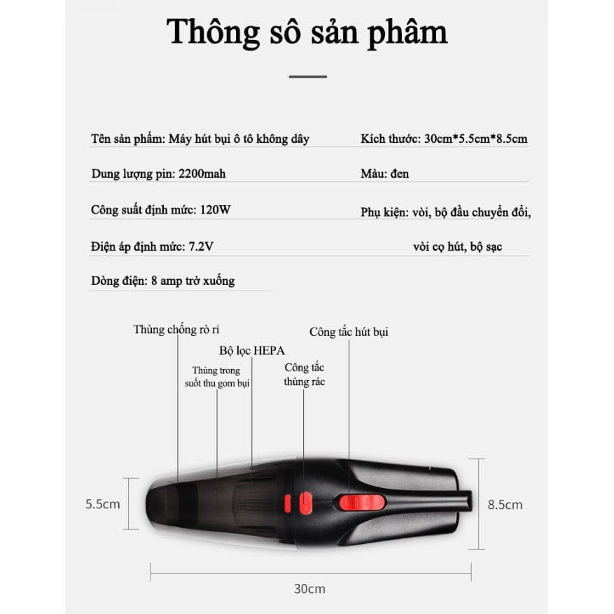 - Máy có động cơ bền bỉ, hoạt động mạnh mẽ với công suất 120W cho lực hút mạnh 6000pa hút sạch bụi bẩn, nước, đồ vật nhỏ thích hợp giúp bạn có thể làm sạch các khu vực nhạy cảm và khó tiếp cận trong ô tô