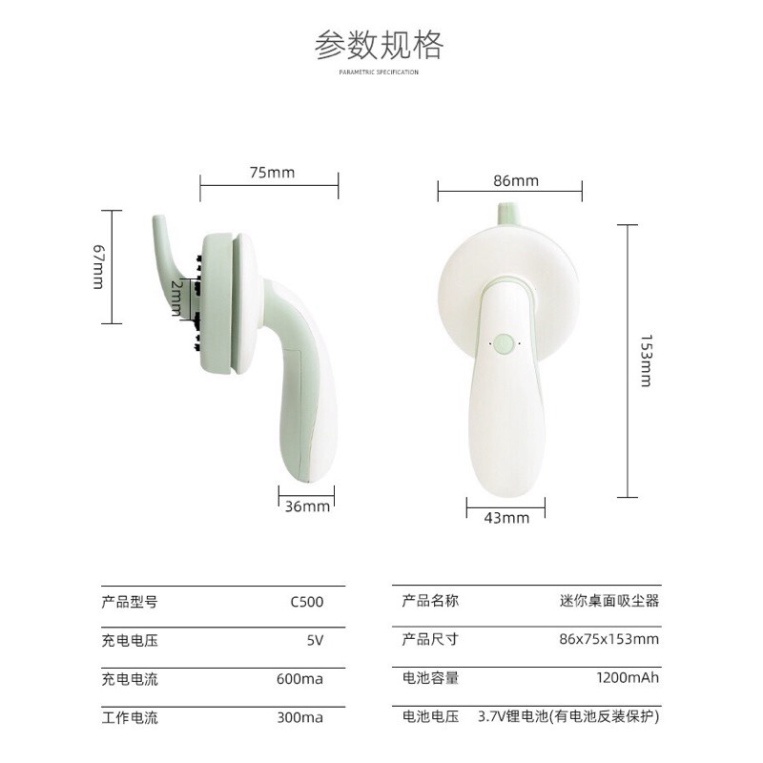 - Chiếc máy hút bụi mini này có dung lượng pin 1200mAh giúp bạn có thể hút bụi trong 2-3 giờ đồng hồ.