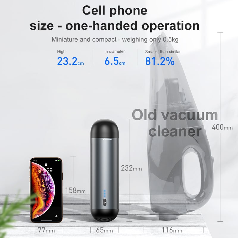 - Baseus Capsule Cordless Vacuum Cleaner có tính cơ động cao , dễ dàng mang theo và sử dụng mọi nơi nhờ được trang bị pin sạc tiện dụng (2000mAh), không lo vướng víu dây điện. Trên thân máy còn được trang bị đèn giúp bạn dễ dàng vệ sinh ở những góc tối trong nhà hoặc xe .