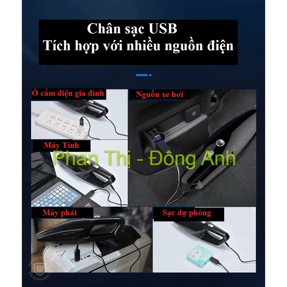* Nguồn cấp: máy dùng chân sạc USB tích hợp với xe hơi, cốc sạc điện thoai, laptop, sạc dự phòng....