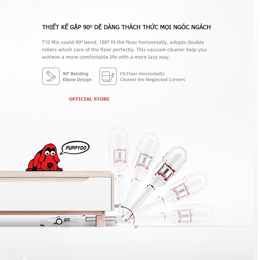 Dòng sản phẩm máy hút bụi cầm tay không dây là một lựa chọn tuyệt vời nếu bạn đang tìm kiếm một chiếc máy mạnh mẽ, đa năng, nhưng nhỏ gọn, dễ mang vác, di chuyển. Đặc biệt chiếc máy hút bụi PUPPYOO T10 Mix này còn được trang bị một ống hút có thể gập 90 độ giúp bạn dễ dàng hút các vị trí cực thấp mà không cần phải nằm bò xuống mặt sàn.