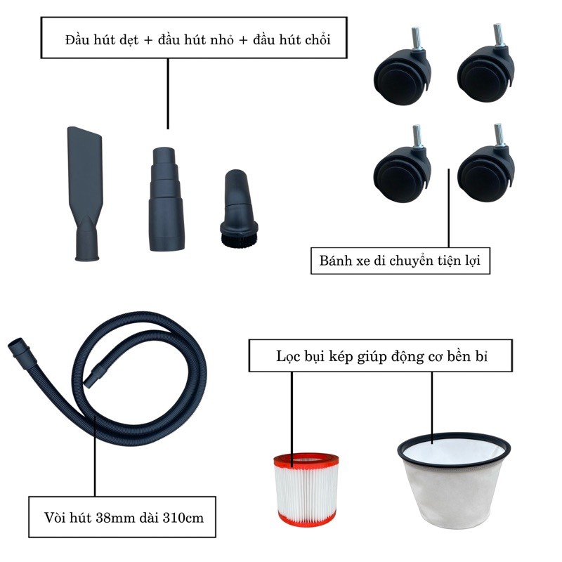 - Dụng tích thùng chứa: 35L - chứa nhiều bụi ít phải vệ sinh thùng máy
